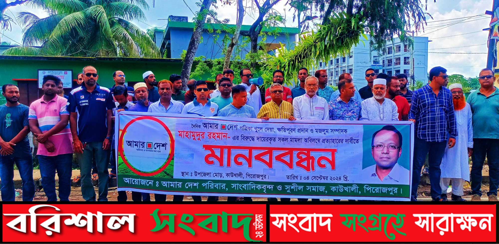 পিরোজপুর প্রতিনিধিঃদৈনিক আমার দেশ পত্রিকা খুলে দেওয়া, ক্ষতিপূরণ প্রদান, সম্পাদক মাহমুদুর রহমান ও মিসেস মাহমুদুর রহমানের বিরুদ্ধে মিথ্যা মামলা প্রত্যাহার ও সাজা বাতিলের দাবীতে পিরোজপুরের কাউখালীতে মানববন্ধন অনুষ্ঠিত হয়।
